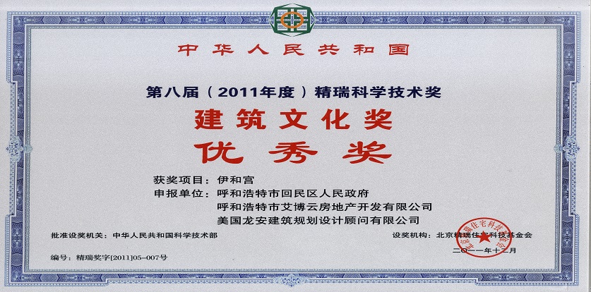 獲獎情況:2011年榮獲國家科技部、全國工商聯房地產商會的“精瑞科學技術獎建筑文化優秀獎”